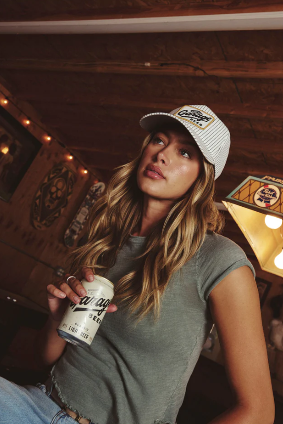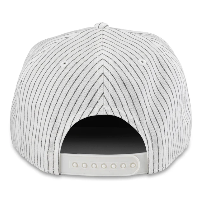 Soft 100% Cotton Pin Stripe 5-panel cap with soft structured crown. Slight curved visor with plastic snap closure. Front logo is soft felt merrowed patch with chain stitch embroidered details.