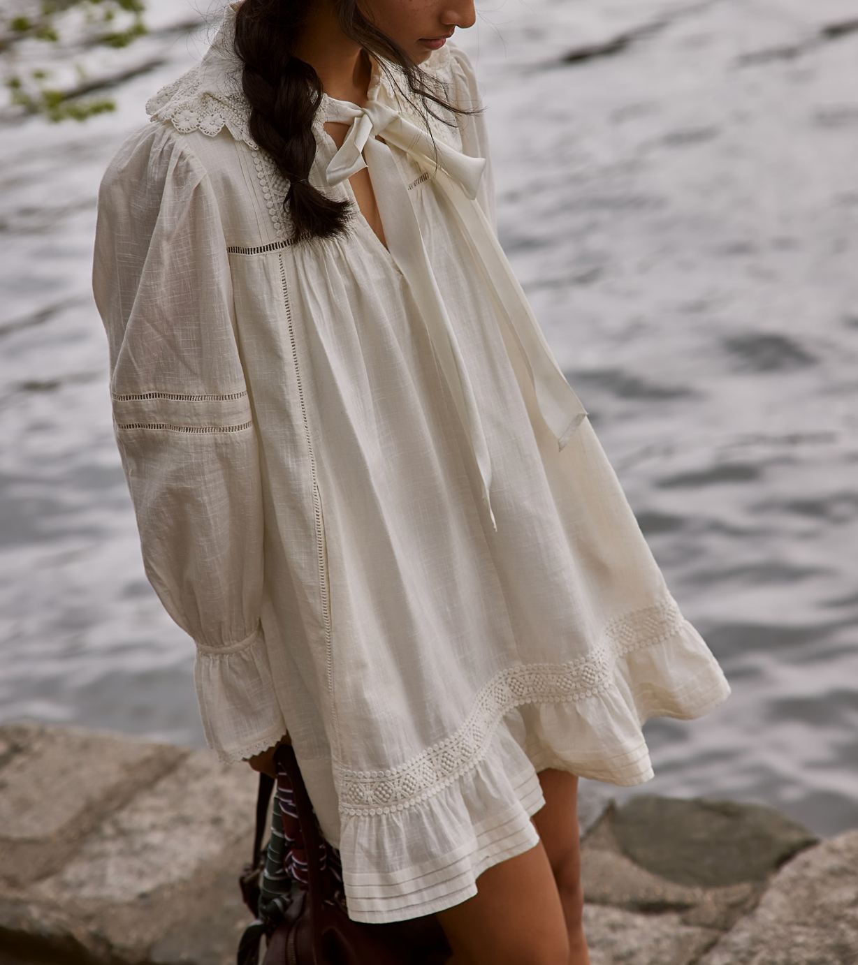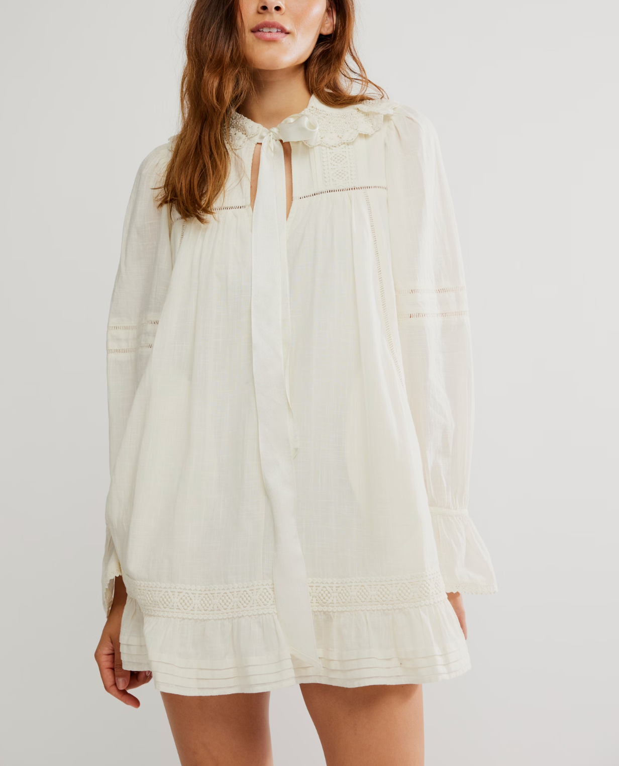 Designed to be a daily staple in your weekly wardrobe rotation, this super versatile, vintage-inspired mini dress features a tie detail at neckline, slightly exaggerated sleeves, and ruffle-adorned detailing for the sweetest finishing touch.