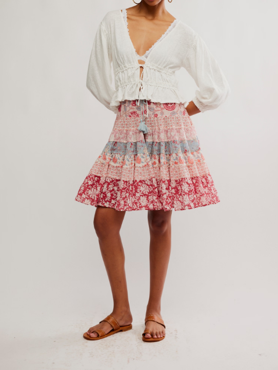 So breezy and beachy, this staple blouse is featured in a cotton-linen fabrication with a V-neckline, shirred bodice, and tie-front details.