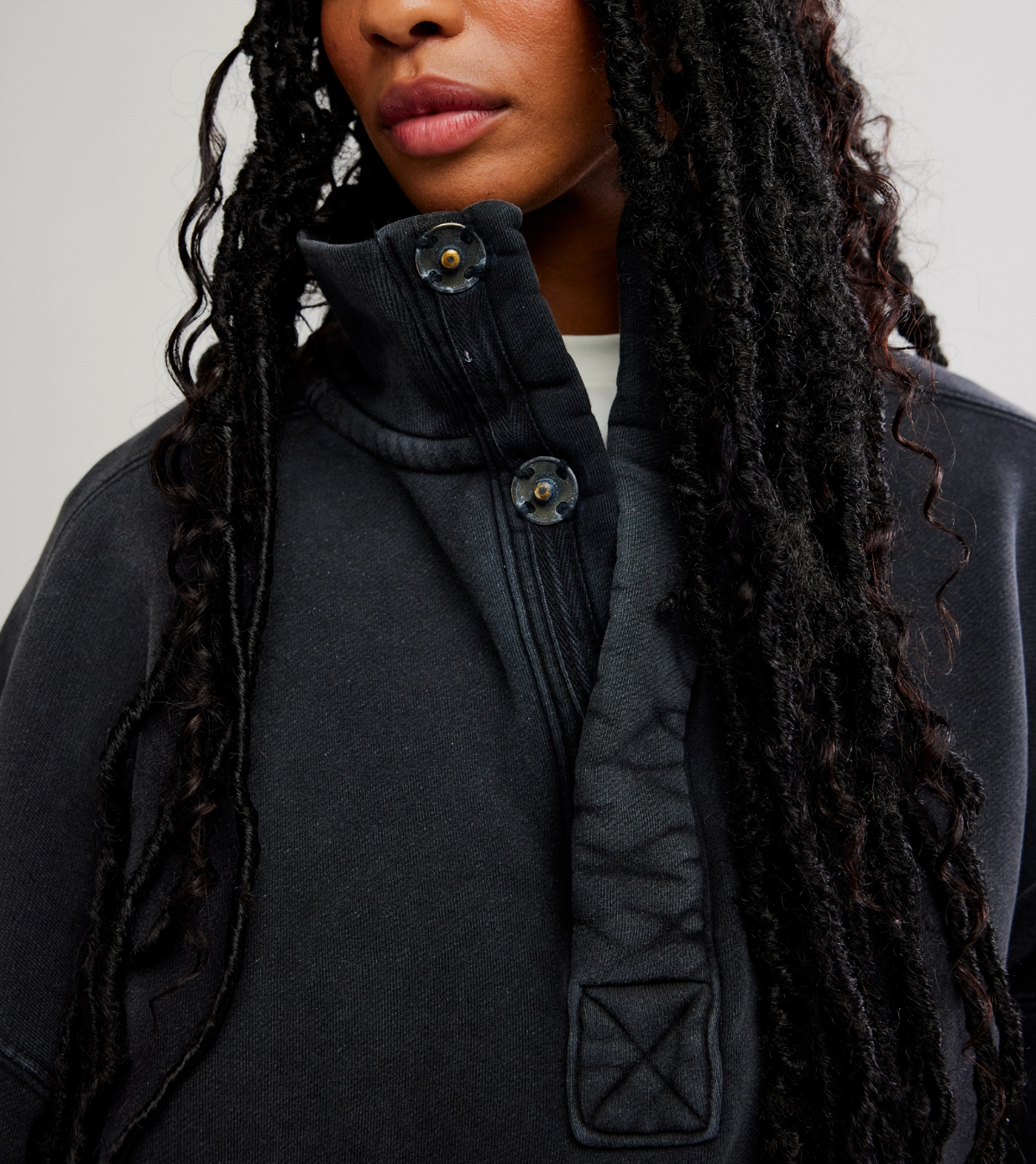 So cozy and essential, this wear-everywhere pullover features a funnel neck design with quarter-button detail and ribbed trimming for added dimension.