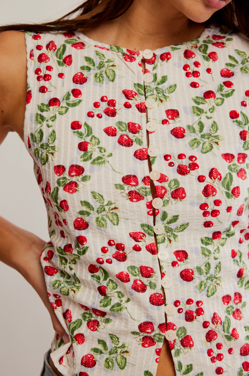 Simple yet chic, this timeless top is featured in a ribbed knit fabrication and slim-fitting silhouette with a scoop-neckline and button-front closures.