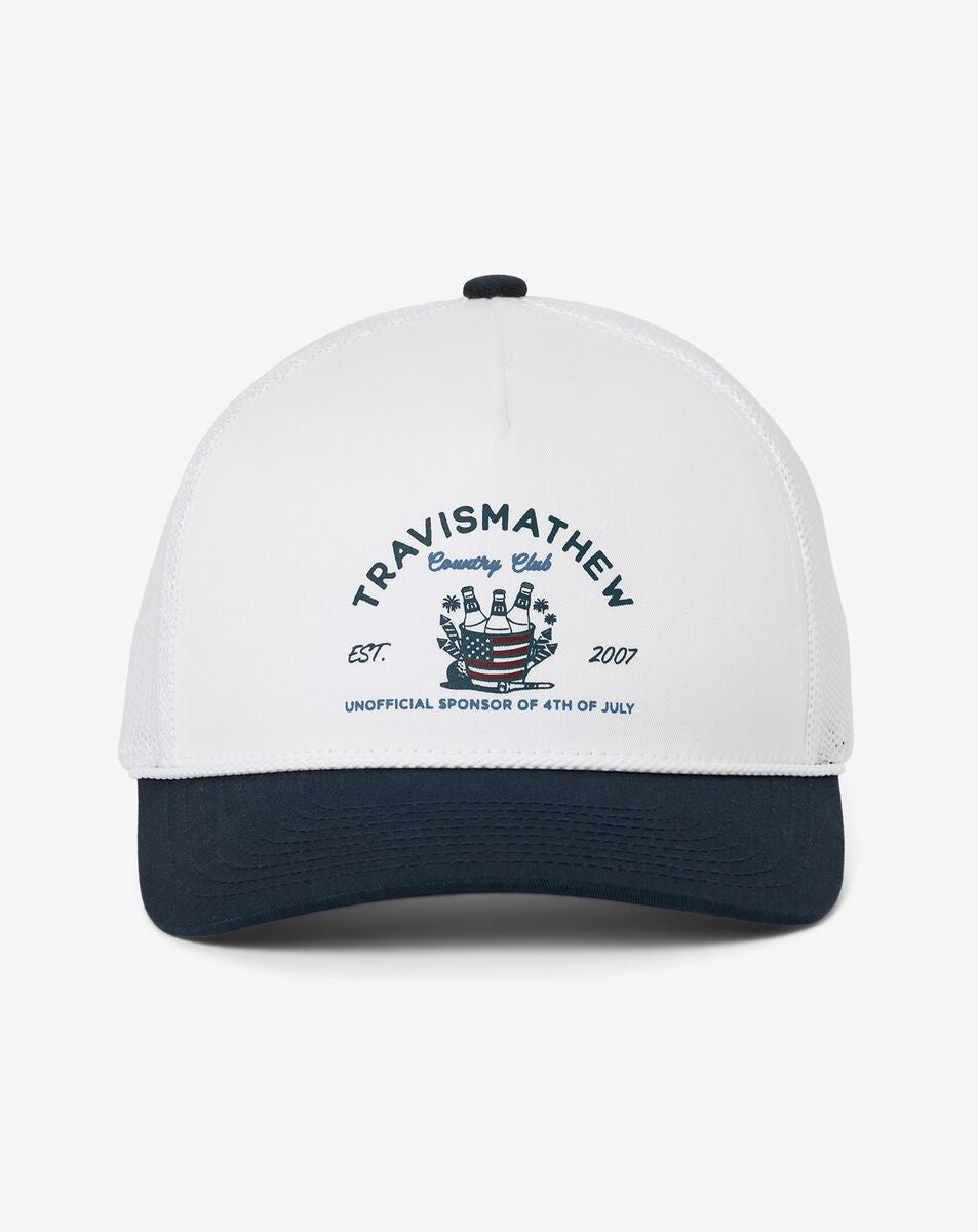 Consider this your official invite to the unofficial party. The FIRECRACKER FIESTA snapback brings backyard energy with a two-toned design, white rope detail across the bill, and a graphic featuring a bucket of beers labeled TravisMathew Country Club—complete with our honorary title: Unofficial Sponsor of the 4th of July. With breathable mesh and a classic snapback fit, it’s basically the life of the party in hat form.